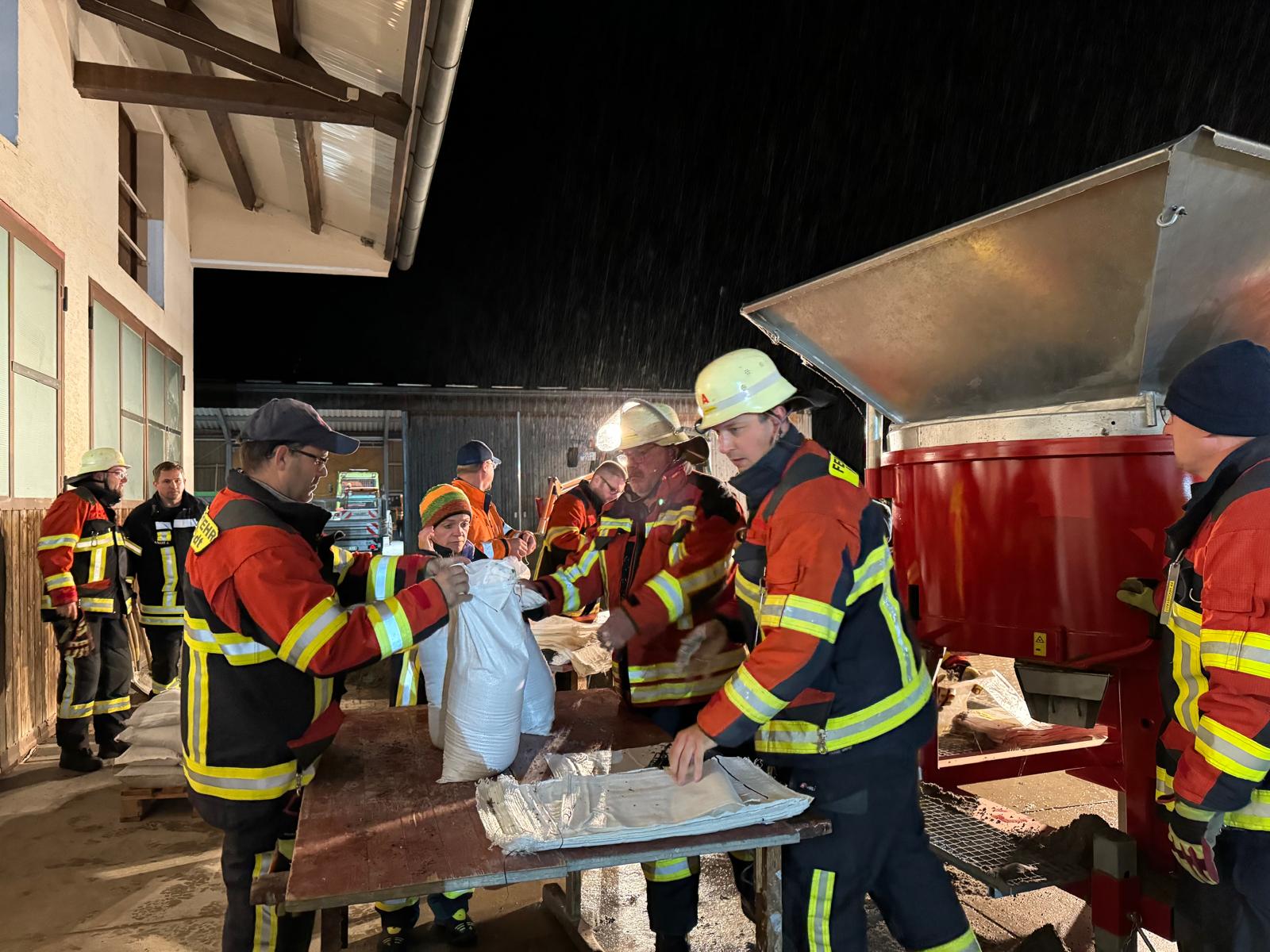 Unser Einsatz begann in der Nacht von Freitag auf Samstag gegen 1:36 Uhr, als im Stadtteil Oberglauheim aufgrund des überraschend stark gestiegenen Nebelbachs der am Abend zuvor gelieferte Sandsackbestand zur Neige ging. Wir füllten in 3 Stunden ca. 1.300 Sandsäcke, welche teilweise nach Oberglauheim verbracht und andererseits als Notfallreserve eingelagert wurde.